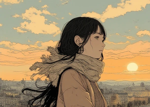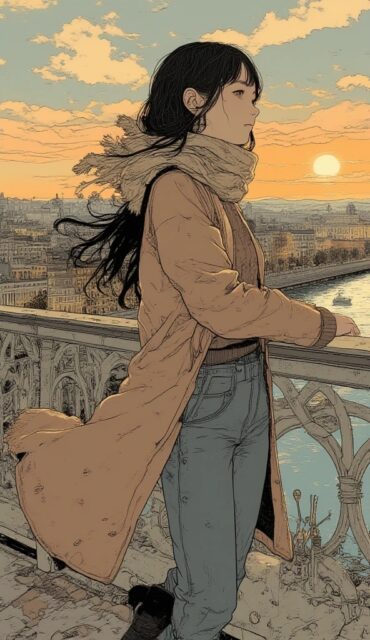 illustration art, anime, high school girl, **Budapest Chain Bridge** (Szechenyi lanchid) at **sunset**, **half-body portrait**, **looking out over the Danube river**, gentle smile, **chic long wool coat**, **slim-fit turtleneck sweater**, **plaid scarf**, **straight denim pants**, **leather boots**, natural light, detailed background, light wind, long black hair flowing, anatomically correct,