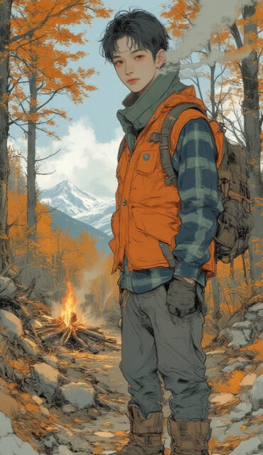 | 全体 | (Japanese man), (salt-faced), handsome, healthy look, short hair, friendly smile, fullbody, (bright orange down vest:1.2), flannel check shirt (blue and green), sturdy denim pants, hiking boots, backpack, outdoor casual fashion, standing near a campfire in an autumn forest, trees with colorful leaves, clear sky, sun shining, looking at the viewer, adventurous atmosphere, masterpiece, best quality, photorealistic |