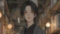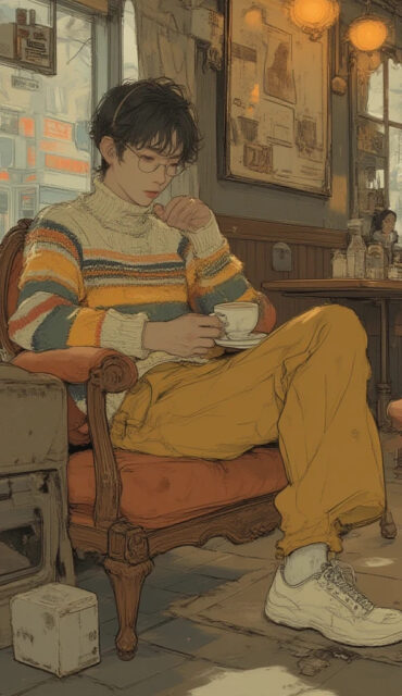 | シチュエーション | sitting on a vintage sofa in a retro cafe, warm interior light, holding a coffee cup, slightly looking down, cozy and artistic atmosphere |
