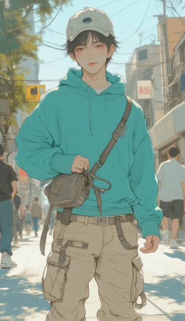 | 全体 | (Japanese man), (salt-faced), handsome, short dark hair, slight smile, energetic expression, fullbody, vivid turquoise hoodie, relaxed fit beige cargo pants, white chunky sneakers, baseball cap (backward), cross-body bag, casual street fashion, standing on a busy city street, blurred background, sunny daylight, looking directly at the camera, dynamic pose, masterpiece, best quality, photorealistic, 4k |