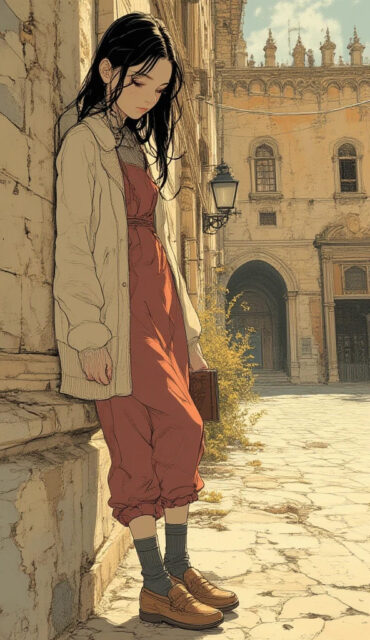 🏛️ シーンのコンセプト説明: 歴史ある城塞、スフォルツェスコ城の中庭や城壁を背景に、芸術や歴史を感じさせる落ち着いたトーンのコーディネートです。少し物思いにふけるような、アーティスティックな雰囲気を表現します。