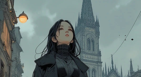 illustration art, anime, high school girl, anime, **standing in Duomo Square (Piazza del Duomo)**, **full-body shot**, **elegant black wool coat, high-neck blouse, plaid mini skirt, opaque tights, ankle boots**, **crossbody chain bag**, **looking up at the Duomo's spire**, **one hand gently holding the coat collar**, **slight smile**, long black hair, anatomically correct, highly detailed background, dramatic lighting, high quality