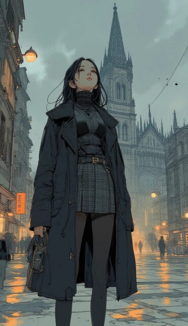 👗 シーンのコンセプト説明: ミラノの象徴である**ドゥオーモ(ミラノ大聖堂)**を背景に、洗練された「ミラノファッション」を意識した、少し大人びたエレガントなコーディネートです。荘厳な大聖堂のスケール感と、主人公の美しいポージングが対比をなします。