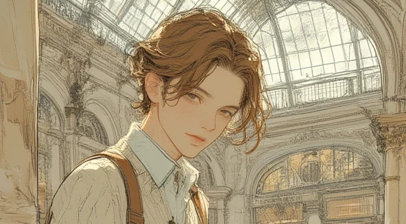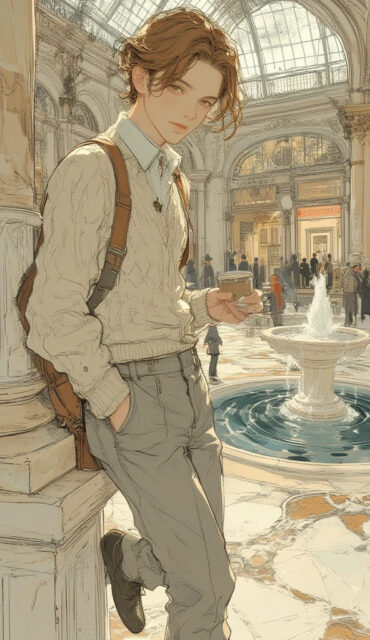 illustration art, anime, masterpiece, best quality, high quality, high resolution, small face, **GUM department store interior**, **ornate glass roof**, **fountain nearby**, 1boy, solo, male focus, anime boy, **gentle smile**, **wavy chestnut hair**, **leaning against a marble pillar**, **casual but sophisticated look**, **cable knit sweater, light grey**, **tailored checkered trousers**, **stylish leather loafers**, **holding a coffee cup**, soft ambient light, warm tone, detailed interior design, shopping trip, **relaxed weekend vibe**, **high-end shopping atmosphere**