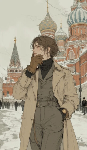 クレムリンの荘厳で重厚な赤レンガの城壁や、城塞内の広場を背景に、洗練されたモダンなスタイルでポージング。ロシアの政治・文化の中心地というシチュエーションに合わせ、少し緊張感のあるクールな表情と、直線的なシルエットの服装を組み合わせます。