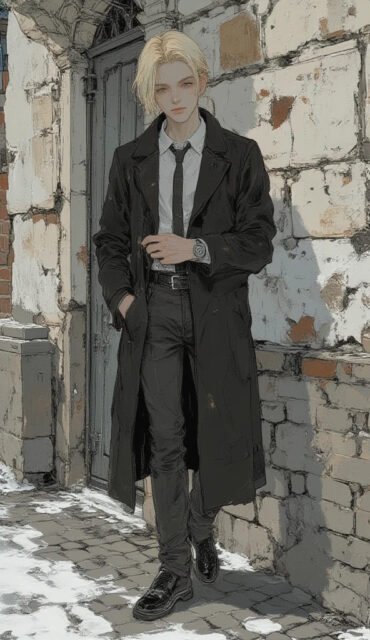 illustration art, anime, masterpiece, best quality, high quality, high resolution, small face, **kremlin wall background**, **cobblestone ground**, 1boy, solo, male focus, anime boy, **cool expression**, **sharp jawline**, **3/4 view**, **standing pose**, **one hand adjusting cuff**, **modern structured outfit**, **black slim-fit coat**, **white collared shirt**, **silver wrist watch**, **tight dark jeans**, **sleek swept-back hair, platinum blonde highlights**, detailed masonry, dramatic shadow, high contrast lighting, urban travel, **sense of awe**, **political center atmosphere**