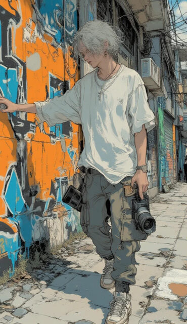illustration art, anime, masterpiece, best quality, high quality, high resolution, small face, silver ash hair, messy hair set, 1boy, solo, male focus, anime boy, cool expression, full body, walking, a hand lightly touching the vivid graffiti wall, holding a single-lens reflex camera in the other hand, Beco do Batman in São Paulo, vibrant street art background, relaxed fit oversized t-shirt, trendy cargo pants, cool sneakers, looking to the side, urban street fashion, dynamic lighting, realistic shading, detailed outfit, cinematic shot,