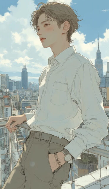 illustration art, anime, masterpiece, best quality, high quality, high resolution, small face, light brown hair, clean side-part hairstyle, 1boy, solo, male focus, anime boy, refreshing smile, upper body, leaning on a terrace railing, looking at the cityscape in the distance, high-rise building rooftop, Avenida Paulista view, São Paulo, white linen shirt, tailored slacks, minimalist accessories, smart casual fashion, bright sunlight, lens flare, detailed clothing texture, cinematic shot,