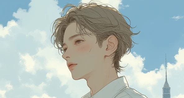 | 髪型・表情 | 明るめの茶髪で、サイドをすっきりさせた清潔感のあるスタイル。遠くを見つめる、自信に満ちた爽やかな笑顔。 |