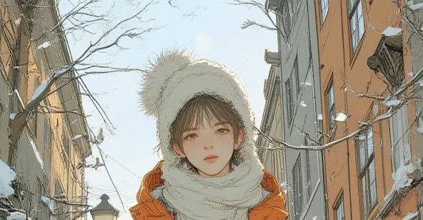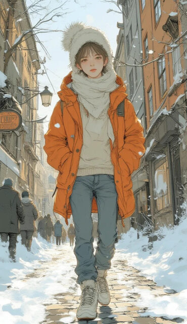 illustration art, anime, masterpiece, best quality, high quality, high resolution, small face, brown hair, fluffy winter hat, 1boy, solo, male focus, anime boy, cheerful smile, full body, walking on cobblestone street in Gamla Stan, looking at the camera, light orange down jacket, thick muffler, denim pants, sneakers, bright color scheme, winter fashion, snow falling lightly, detailed medieval buildings and colorful facades, soft sunlight, highly detailed background
