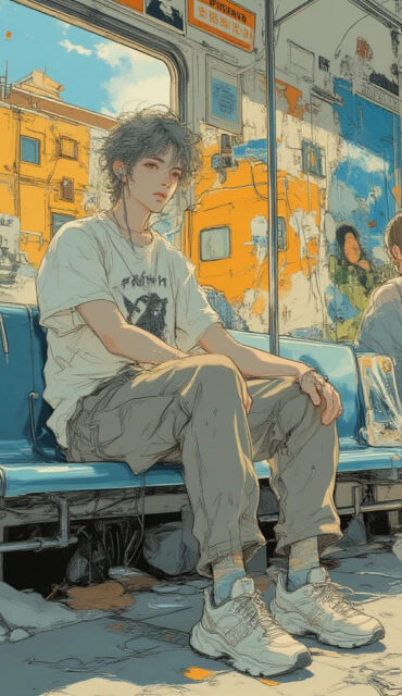 「世界一長い美術館」とも呼ばれるストックホルム地下鉄の、鮮やかなアート壁面を背景に。夏の暑さに合わせた、ルーズなTシャツとハーフパンツのストリートスタイル。20代前半の男性が、駅のベンチに座ってイヤホンで音楽を聴きながらリラックス。都会的でアート性の高い、クールなファッション誌のグラビアページのような仕上がりを狙います。