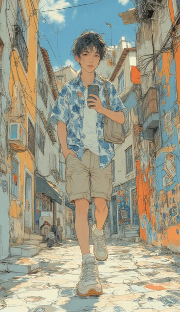 🎨 アルファマ地区の急な石畳の坂道や、カラフルなストリートアートを背景に、街歩きを楽しむアクティブな若者。日差しが強い初夏を意識し、通気性の良い柄シャツと動きやすいチノショーツで爽やかさを演出。観光の楽しさが伝わる、自然で明るいポーズを狙います。