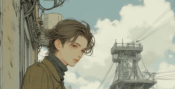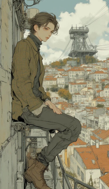 illustration art, anime, masterpiece, best quality, high quality, high resolution, small face, neatly styled brown hair, thoughtful expression, 1boy, solo, male focus, anime boy, upper body shot, leaning on a railing, looking out over the city, Santa Justa Lift (Elevador de Santa Justa) in the background, autumn sunlight, cityscape view of Lisbon, plaid blazer (brown/green), thin turtleneck knit sweater (dark gray), dark wash jeans, leather boots, wristwatch, smart casual fashion, slightly overcast light, detailed architecture, magazine photo quality, serious look
