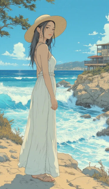illustration art, anime, woman standing by La Jolla Cove San Diego, long white resort dress, sun hat, sea breeze, waves crashing on rocks, sunlight reflection, serene smile, full-body portrait, anime style, bright and clear sky