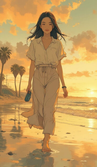 illustration art, anime, woman walking on Coronado Beach San Diego, sunset light, linen shirt, flowy long skirt, barefoot, holding sandals, gentle smile, warm glow, detailed ocean reflection, anime style