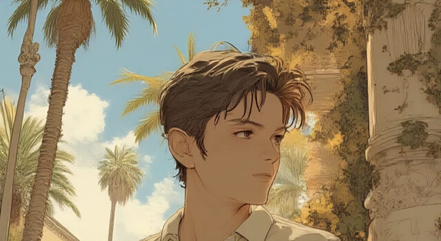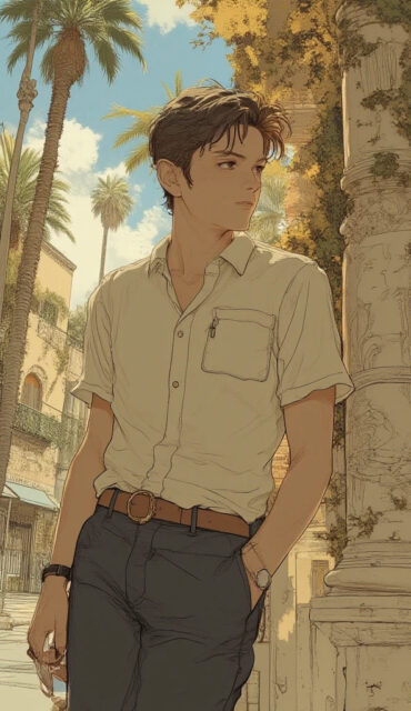illustration art, anime, masterpiece, best quality, high quality, high resolution, small face, brown hair, neat side-parted hair, 1boy, solo, male focus, anime boy, thoughtful expression, upper body, leaning against a stone column, holding sunglasses, Balboa Park, ornate Spanish Colonial architecture, lush palm trees, soft afternoon light, collared polo shirt, dark chino pants, leather belt, wristwatch, preppy fashion, classic American casual, autumn texture, elegant posing, detailed stone texture, magazine photo style