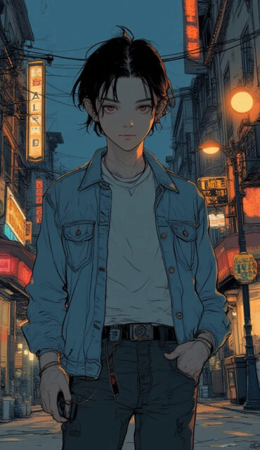 illustration art, anime, masterpiece, best quality, high quality, high resolution, small face, black hair, slightly messy hairstyle, 1boy, solo, male focus, anime boy, confident smirk, half body, standing on a dimly lit street corner, holding a small camera, Gaslamp Quarter, Victorian style buildings, glowing street lamps and neon signs, night time, unbuttoned denim jacket, plain t-shirt, slim fit jeans, ankle boots, urban chic fashion, sophisticated traveler look, deep contrast lighting, relaxed posture, bokeh effect in background lights, cinematic color grading