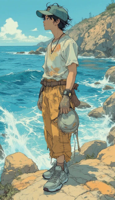 illustration art, anime, masterpiece, best quality, high quality, high resolution, small face, black hair, natural short hair, 1boy, solo, male focus, anime boy, slight smile, full body, standing on coastal rocks, looking out at the ocean, right hand holding a baseball cap, La Jolla Cove, clear blue ocean, rugged coastline, bright sunny day, graphic print t-shirt, loose fit short pants, sneakers, layered necklace, street casual fashion, summer travel look, vibrant color palette, dynamic pose, detailed water spray, cinematic shot