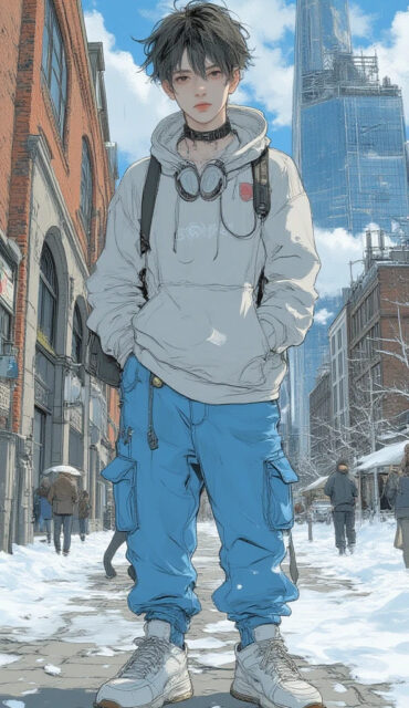 illustration art, anime, masterpiece, best quality, high quality, high resolution, small face, black hair, messy hairstyle, 1boy, solo, male focus, anime boy, energetic expression, full body, standing near the glass facade of a modern building, one hand in his pocket, wearing a headphone around his neck, Elbphilharmonie Hamburg (Elphi), background features the unique glass and brick architecture, sunny weather, oversized light gray hoodie, bright blue cargo pants, sneakers, carrying a backpack slung over one shoulder, street casual fashion, bright clear sunlight, detailed glass structure, cinematic shot, bright colors