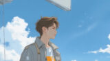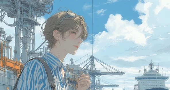 illustration art, anime, masterpiece, best quality, high quality, high resolution, small face, light brown hair, slightly wavy hairstyle, 1boy, solo, male focus, anime boy, cheerful expression, full body, standing by the port railing, holding a cap, looking towards the sea, Port of Hamburg (HafenCity area), large ships and industrial cranes in the background, summer atmosphere, striped short-sleeve shirt (blue and white), white cotton shorts, boat shoes, wearing sunglasses on his head, refreshing marine fashion, bright summer daylight, detailed harbor machinery and water, cinematic shot, bright colors