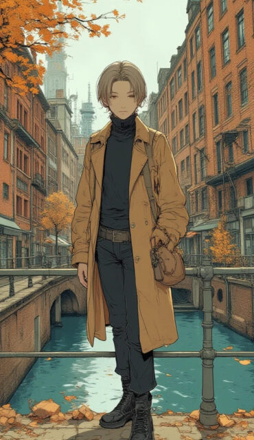 illustration art, anime, masterpiece, best quality, high quality, high resolution, small face, brown hair, neat short haircut, 1boy, solo, male focus, anime boy, gentle expression, full body, standing on a historic brick bridge, leaning slightly on the railing, looking out over the canal, Speicherstadt (Hamburg's historic warehouse district), distinctive brick architecture and canals in the background, autumn atmosphere, long camel trench coat, dark turtleneck sweater, fitted dark pants, black leather boots, holding a small travel bag, urban chic fashion, natural soft overcast light, detailed brickwork and water reflections, cinematic shot, bright colors