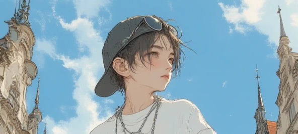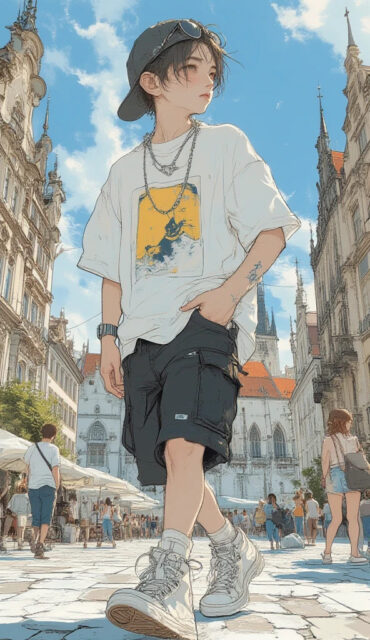 旧市街広場の賑わいと、ティーン教会を背景にした明るい夏の昼下がりをイメージ。動きやすく、旅慣れた雰囲気のストリートカジュアルコーデです。オーバーサイズのTシャツとキャップ、サングラスで、日差しに映えるアクティブさと親しみやすさを強調しました。旅を楽しむ若者の活力を表現。(142文字)