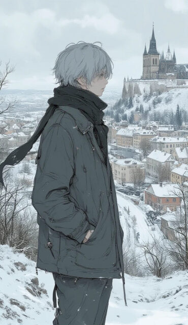 illustration art, anime, masterpiece, best quality, high quality, high resolution, small face, silver hair, messy short hair, 1boy, solo, male focus, anime boy, thoughtful expression, upper body shot, standing, hands in pockets, looking at the view, view of Prague Castle from a snowy hill, Prague, Czech Republic, cold winter day, snow falling lightly, dark gray quilted down jacket, thick black scarf, slim-fit pants, warm winter fashion, soft overcast lighting, detailed cityscape background, cinematic shot,
