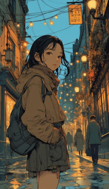 illustration art, anime, woman walking in Temple Bar Dublin, wool skirt, short jacket, warm pub lights, cobblestone street, lively yet cozy atmosphere, anime style