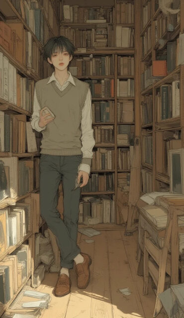 illustration art, anime, masterpiece, best quality, high quality, high resolution, small face, black hair, neat short hairstyle, 1boy, solo, male focus, anime boy, gentle expression, full body, standing, leaning against a tall wooden shelf, holding a book, Trinity College Library Long Room, floor-to-ceiling wooden bookshelves, natural light filtering in, V-neck knit sweater, collared shirt, tailored slacks, leather loafers, intellectual fashion, subtle shadows, detailed books and wood grain, cinematic shot, warm indoor lighting