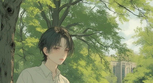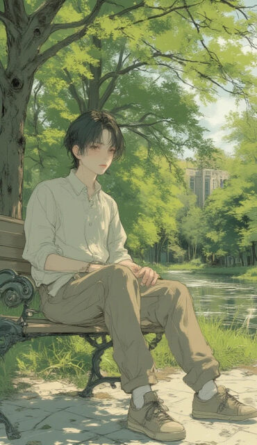 illustration art, anime, masterpiece, best quality, high quality, high resolution, small face, black hair, soft parted hairstyle, 1boy, solo, male focus, anime boy, calm expression, full body, sitting on a park bench, legs crossed, looking at the distance, St. Stephen's Green park, lush green trees, calm pond in the background, simple linen shirt, chino pants, canvas shoes, earth tones, relaxed outdoor fashion, soft dappled sunlight, detailed foliage, cinematic shot, peaceful ambiance