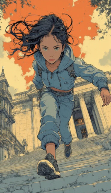 illustration art, anime, woman running up the Rocky Steps Philadelphia Museum of Art, sporty hoodie, jogger pants, energetic vibe, bright sky, anime style, full-body