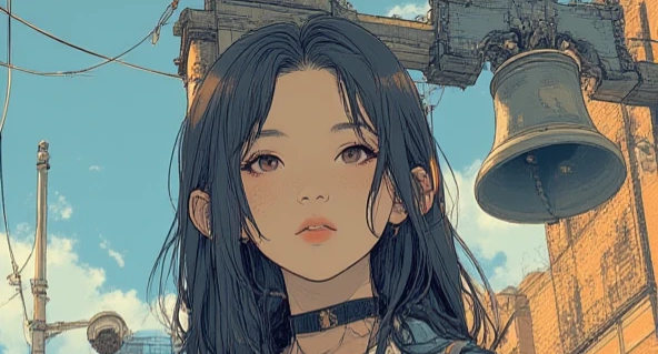 illustration art, anime, woman standing near Liberty Bell Philadelphia, denim jacket, white knit top, calm historical atmosphere, soft sunlight, full-body, anime style