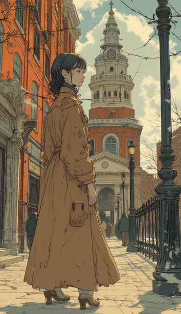 illustration art, anime, woman walking near Independence Hall Philadelphia, long brown coat, tight skirt, historical red brick building, elegant posture, anime style, full-body