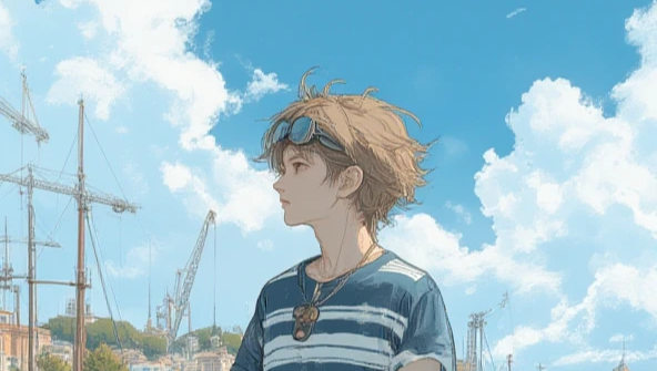 illustration art, anime, masterpiece, best quality, high quality, high resolution, small face, light brown hair, slightly wind-blown hairstyle, 1boy, solo, male focus, anime boy, refreshed expression, full body, standing by the waterfront, looking towards the sea, Porto Antico (Genoa), historic ships and cranes background, clear summer sky, navy blue and white striped t-shirt, crisp white short pants, canvas deck shoes, sunglasses on head, marine resort casual fashion, bright clear sunlight, detailed water surface, cinematic shot,