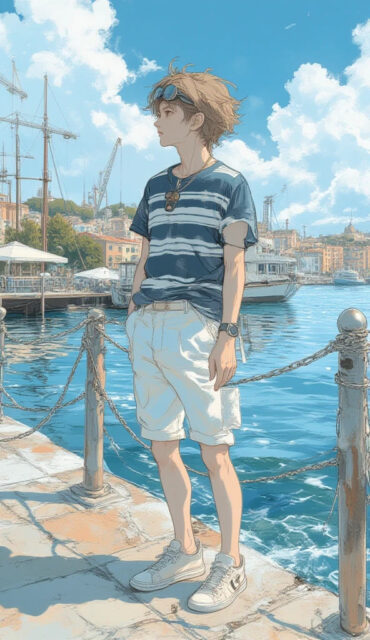 中世の歴史を感じさせる**旧港(ポルト・アンティーコ)**の船着き場やクレーンを背景に、明るく爽やかな夏のマリンスタイルを表現。ボーダーTシャツと白のショートパンツで、港町らしいリラックスした雰囲気を狙います。海風を感じながら、港の景色をバックに遠くを見つめる、開放感のあるポーズです。