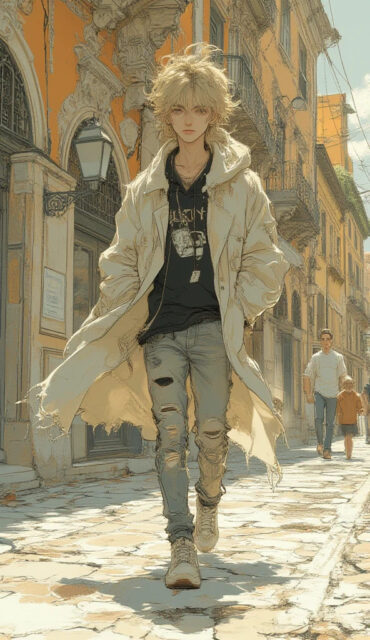 illustration art, anime, masterpiece, best quality, high quality, high resolution, small face, dyed blond messy hair, 1boy, solo, male focus, anime boy, slightly smiling at the camera, full body, walking on the cobblestone street, head slightly turned to the side, Strada Nuova (Via Garibaldi, Genoa), ornate Renaissance palace facade background, sunny spring morning, oversized light trench coat, black hoodie, ripped skinny jeans, chunky sneakers, street mix fashion, natural sunlight casting soft shadows, detailed stone pavement, cinematic street photography style,