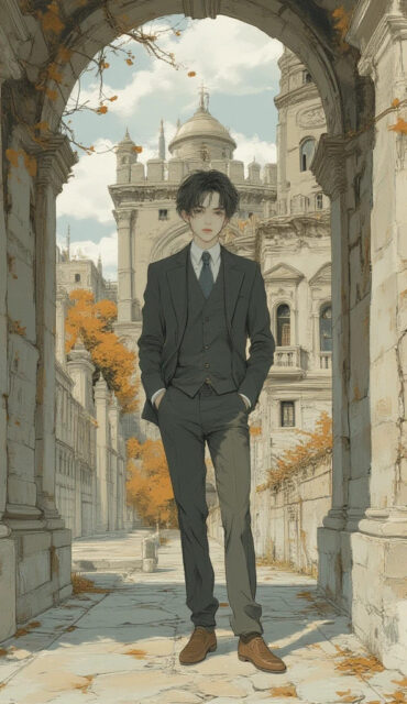 illustration art, anime, masterpiece, best quality, high quality, high resolution, small face, black neat hair, gentle expression, 1boy, solo, male focus, anime boy, thoughtful expression, full body, standing under a stone archway, one hand in pocket, Palazzo Ducale (Genoa), massive stone walls and columns background, cloudy autumn afternoon, dark gray tailored blazer, matching slacks, white collared shirt (no tie), leather loafers, classic formal fashion, soft diffused lighting, detailed stone texture, cinematic perspective,