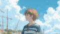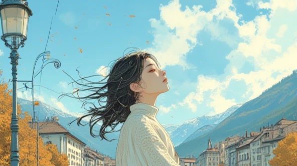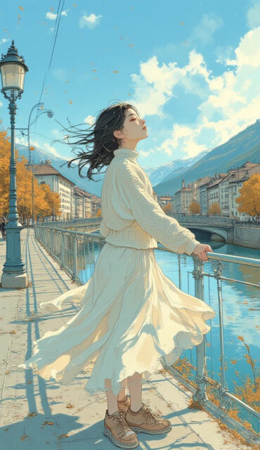 illustration art, anime, woman standing on bridge over Aare River Bern, white knit sweater, long flowy skirt, fresh wind, bright clean sky, natural soft smile, full-body, anime style