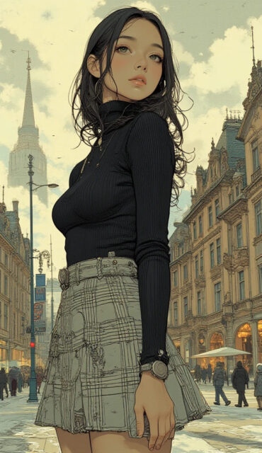illustration art, anime, woman posing near Bundeshaus Bern Switzerland, black turtleneck knit, checkered skirt, structured modern style, historic architecture, midday light, elegant confident pose, full-body, anime style