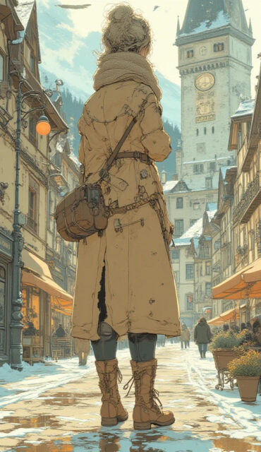 illustration art, anime, woman standing near Zytglogge Bern Switzerland, beige long coat, knit scarf, middle boots, historical clock tower, stone street, elegant traveler, pastel light, full-body, anime style