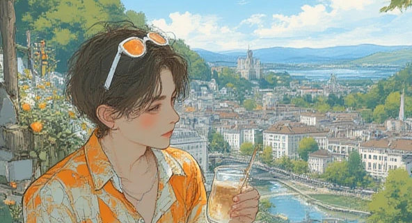ベルン旧市街を一望できる有名なローズガーデンを背景に。太陽の光を浴びたオープンカラーの総柄シャツとショートパンツで、爽やかで開放的な夏のバカンスを表現。リラックスしたポーズと明るい色味で、心地よい夏の午後を演出します。背景のバラ園の豊かな緑と旧市街の赤レンガ屋根とのコントラストが美しいシーンです。