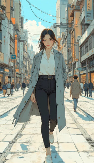 illustration art, anime woman walking in Bankenviertel Frankfurt Germany, modern skyscrapers, white shirt, black skinny pants, long gray coat, minimal chic fashion, city sunlight reflection, confident smile, full-body, clean atmosphere