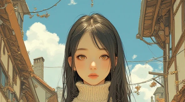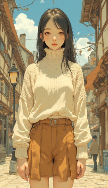 illustration art, anime woman standing at Römerberg Frankfurt Germany, timber-framed buildings background, beige knit sweater, brown flare skirt, soft warm tone, gentle feminine style, full-body, bright clear sky