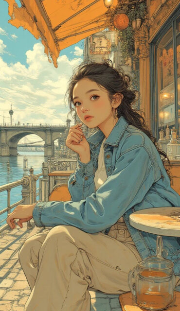 illustration art, anime woman sitting at cafe near Main River Frankfurt Germany, denim jacket, beige wide pants, relaxed casual fashion, river breeze, warm afternoon light, medium-full body, calm expression