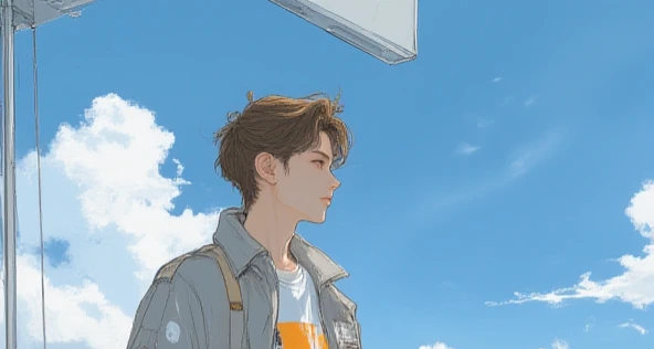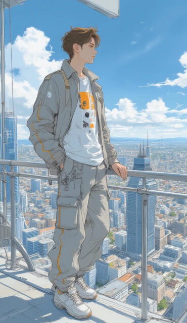 illustration art, anime, masterpiece, best quality, high quality, high resolution, small face, brown hair, short neat hair, 1boy, solo, male focus, anime boy, confident expression, upper body, looking out over the city, hand on railing, Main Tower observation deck in Frankfurt, clear spring afternoon, bright sunlight, oversized jacket (light gray), matching wide-leg pants, graphic t-shirt (white), high-tech sneakers, bright and crisp colors, detailed city background, natural posing, urban street fashion, high-rise buildings, energetic atmosphere