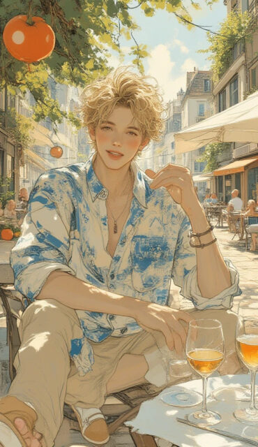 illustration art, anime, masterpiece, best quality, high quality, high resolution, small face, blonde hair, messy medium-length hair, 1boy, solo, male focus, anime boy, cheerful expression, full body, sitting at an outdoor table, holding a glass of apple wine, Sachsenhausen street (Apple Wine district) in Frankfurt, summer daylight, patterned open-collar shirt (blue and white), comfortable short pants (beige), canvas shoes, soft dappled sunlight, detailed background of street cafes and plants, natural posing, resort casual fashion, relaxed and joyful mood