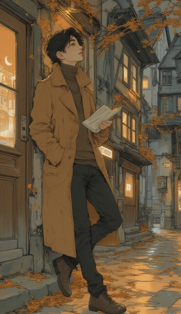 illustration art, anime, masterpiece, best quality, high quality, high resolution, small face, black hair, slightly wavy hair, 1boy, solo, male focus, anime boy, gentle smile, full body, standing, leaning against a half-timbered house, holding a travel guidebook, Römerberg (Römer Square) in Frankfurt, autumn evening, low angle shot, long wool coat (camel), turtleneck sweater (dark brown), slim-fit trousers (black), leather ankle boots, warm lighting, detailed background architecture, cinematic shot, natural posing, classic casual fashion, high contrast, moody atmosphere