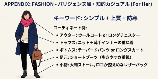 4. ファッションアドバイス(男女別):この街の雰囲気に馴染む、機能的かつおしゃれなコーディネート提案(冬なら重ね着、夏ならスマートカジュアルなど、現在の季節を想定)
