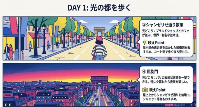 2. 3日間のモデルコース: > 1日目、2日目、3日目と名所のモデルコース(各スポット)と簡単な見どころ、その場所で撮れる「映え写真」のポイントを記述してください。