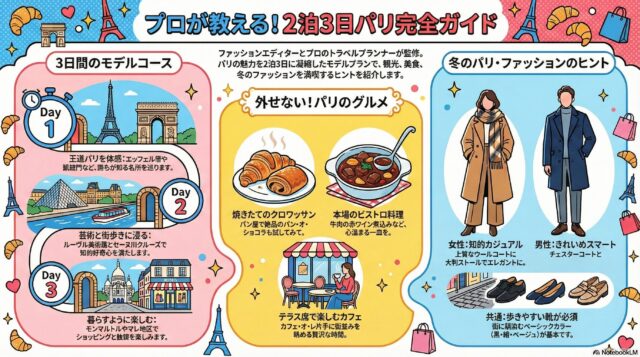 しおり作成に向け、フランス・パリの**「2泊3日・旅のしおり」**のデータを、以下の構成で作成してください。